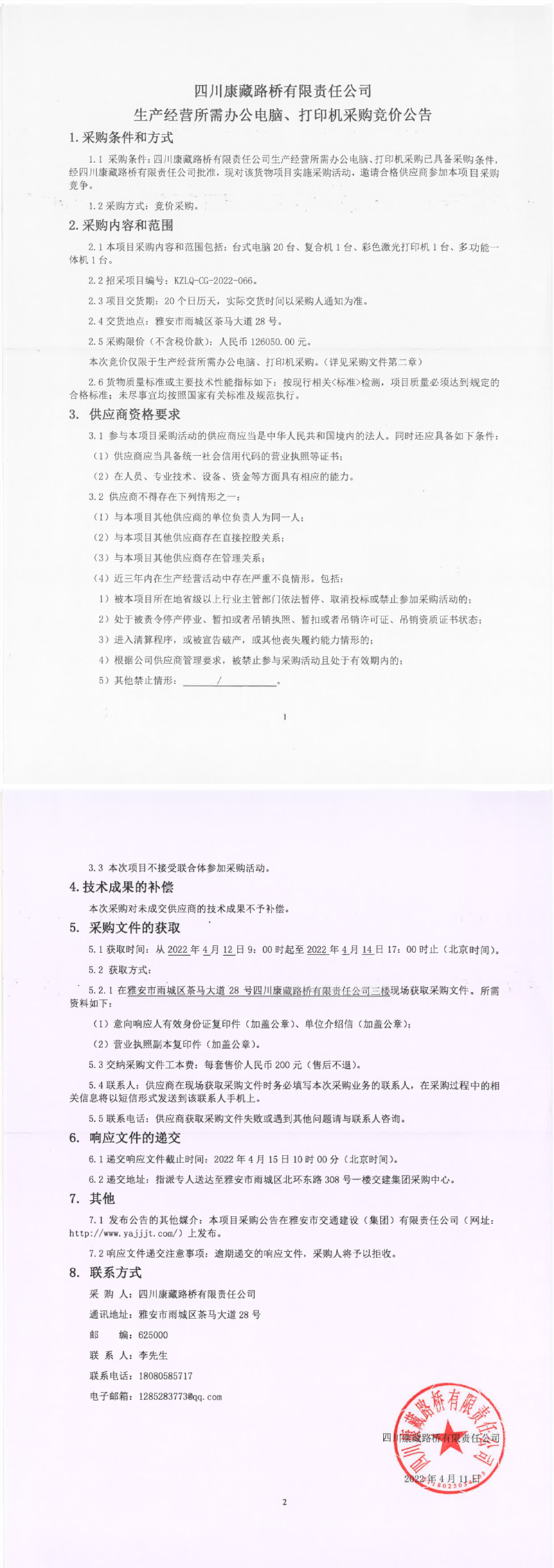四川康藏路橋有限責任公司生產(chǎn)經(jīng)營所需辦公電腦、打印機采購競價公告