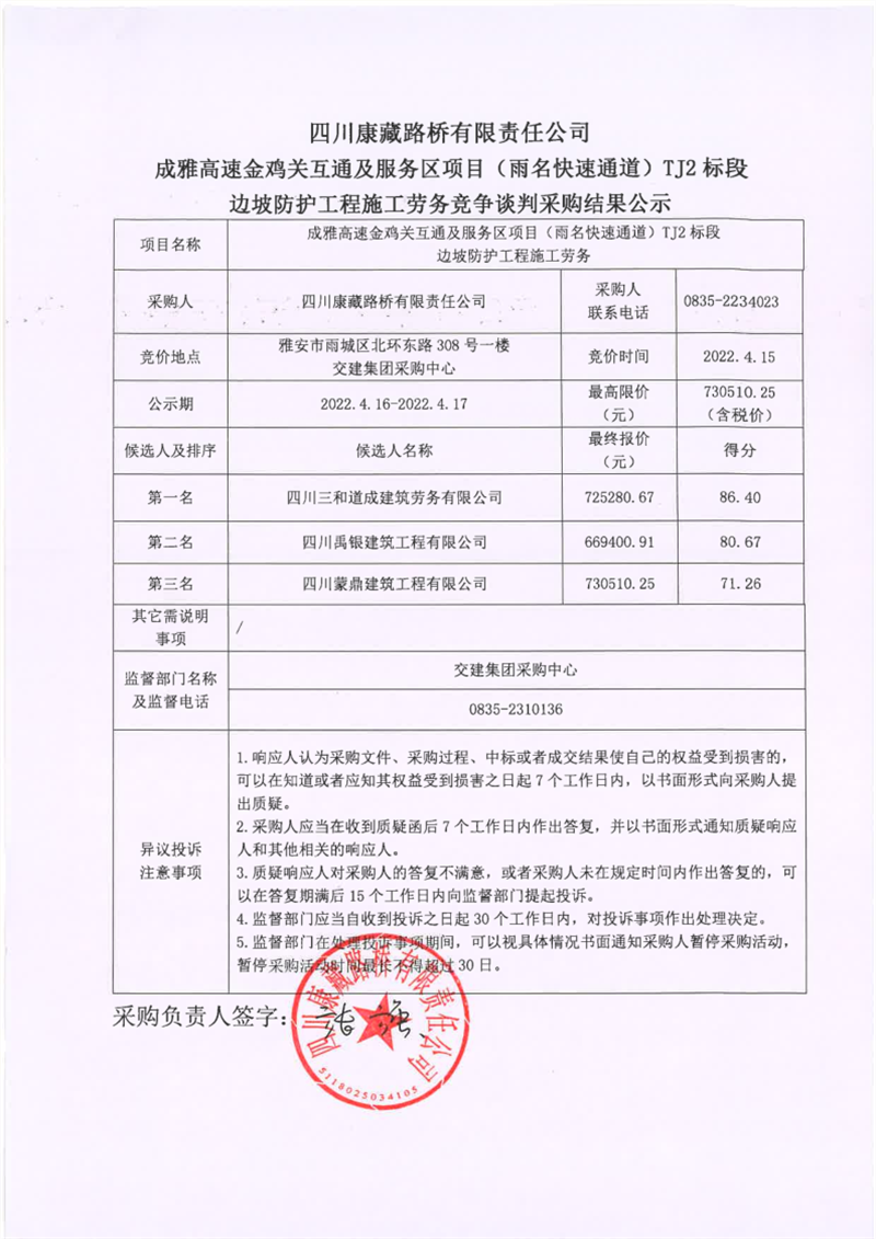 四川康藏路橋有限責(zé)任公司成雅高速金雞關(guān)互通及服務(wù)區(qū)項目(雨名快速通道)TJ2標(biāo)段邊坡防護工程施工勞務(wù)競爭談判采購結(jié)果公示