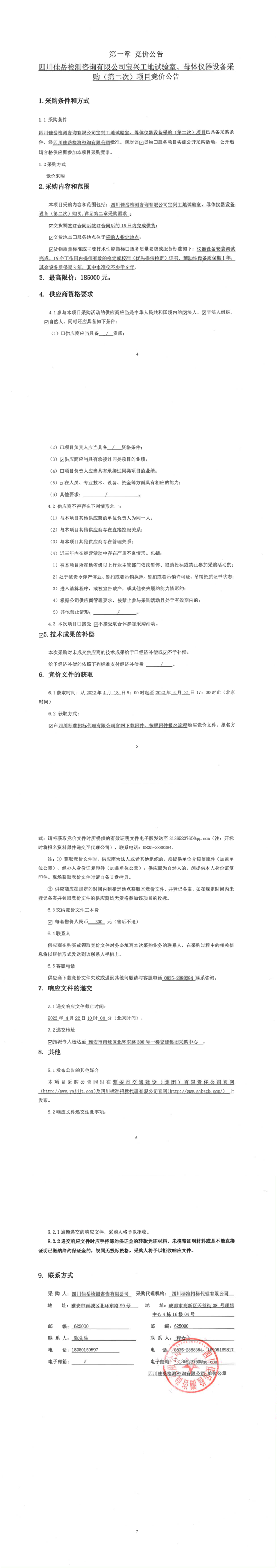 四川佳岳檢測咨詢有限公司寶興工地試驗室、母體儀器設備采購(第二次)項目競價公告