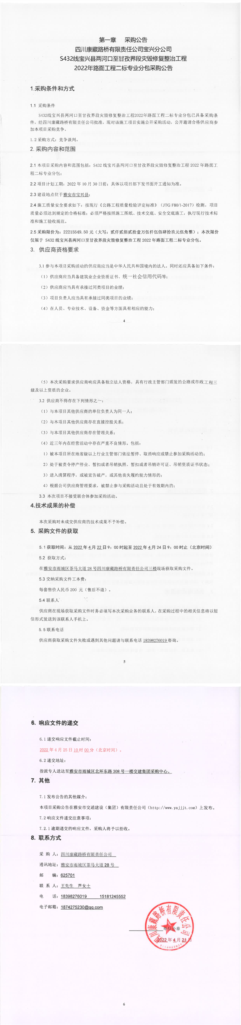 四川康藏路橋有限責(zé)任公司S432線寶興縣兩河口至甘孜界段災(zāi)毀修復(fù)整治工程2022年路面工程二標(biāo)專業(yè)分包采購(gòu)公告