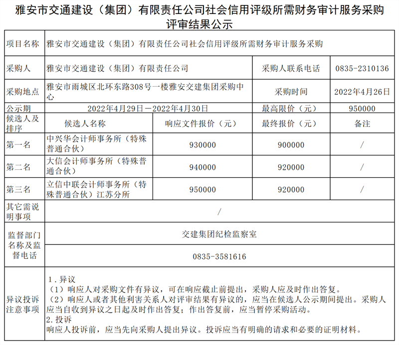 雅安市交通建設(shè)(集團(tuán))有限責(zé)任公司社會信用評級所需財務(wù)審計服務(wù)采購評審結(jié)果公示