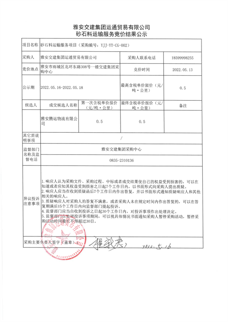 雅安交建集團(tuán)運(yùn)通貿(mào)易有限公司砂石料運(yùn)輸服務(wù)競價結(jié)果公示