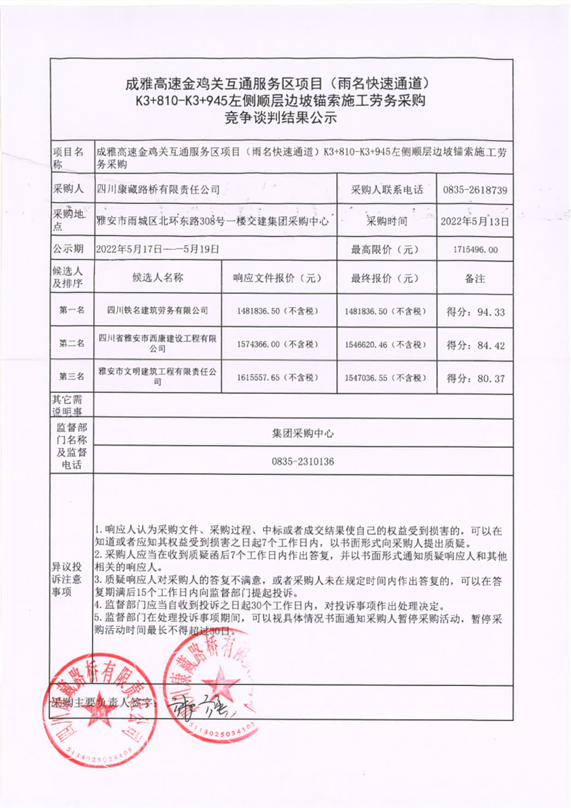四川康藏路橋有限責任公司成雅高速金雞關(guān)互通服務區(qū)項目(雨名快速通道)K3+810-K3+945左側(cè)順層邊坡錨索施工勞務采購競爭談判結(jié)果公示