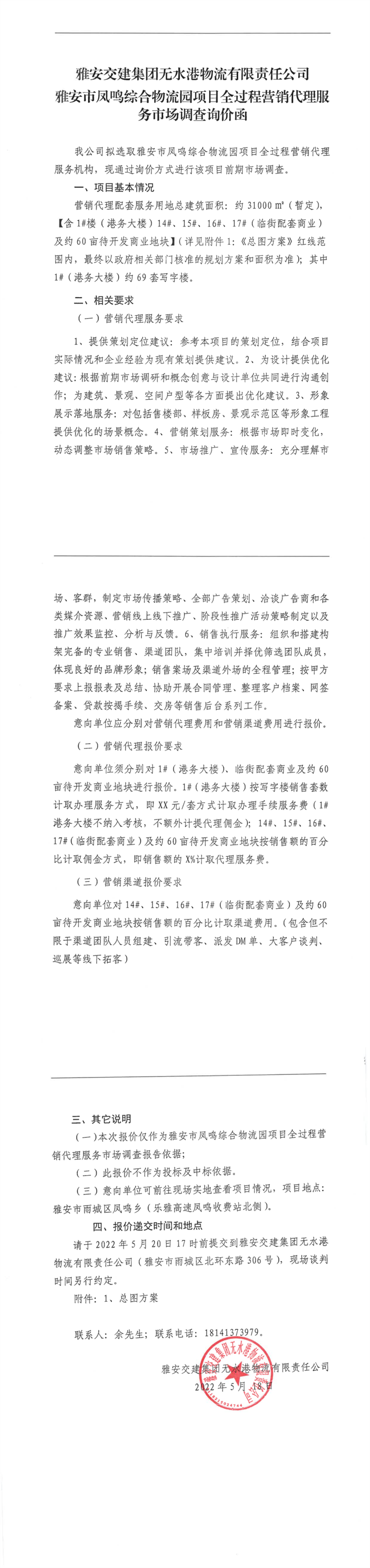 雅安交建集團(tuán)無(wú)水港物流有限責(zé)任公司雅安市鳳鳴綜合物流園項(xiàng)目全過(guò)程營(yíng)銷(xiāo)代理服務(wù)市場(chǎng)調(diào)查詢(xún)價(jià)函
