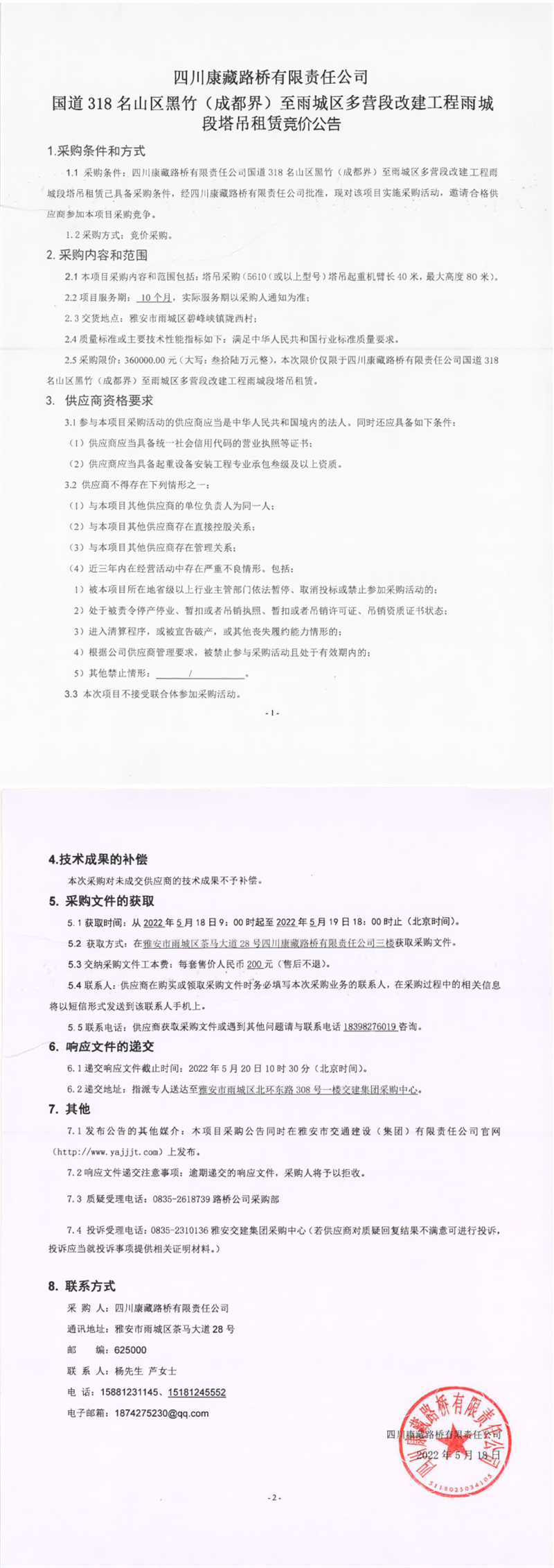 四川康藏路橋有限責任公司國道318名山區(qū)黑竹(成都界)至雨城區(qū)多營段改建工程雨城段塔吊租賃競價公告