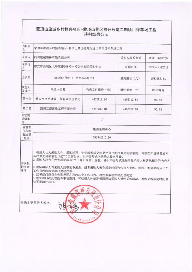 四川康藏路橋有限責(zé)任公司蒙頂山旅游鄉(xiāng)村振興項(xiàng)目-蒙頂山景區(qū)提升改造二期項(xiàng)目停車(chē)場(chǎng)工程談判結(jié)果公示