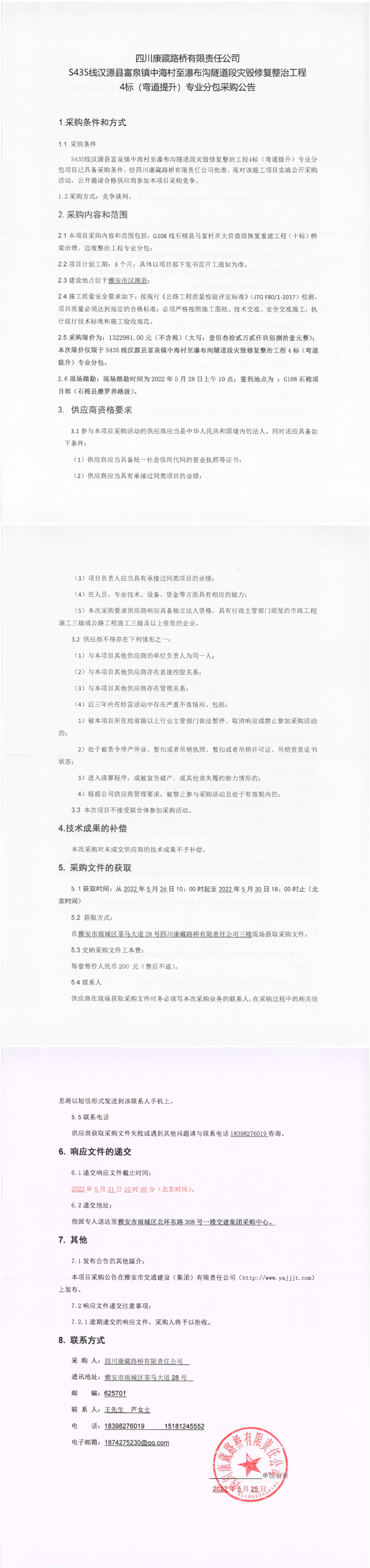 四川康藏路橋有限責(zé)任公司S435線漢源縣富泉鎮(zhèn)中海村至瀑布溝隧道段災(zāi)毀修復(fù)整治工程4標(biāo)(彎道提升)專業(yè)分包采購(gòu)公告