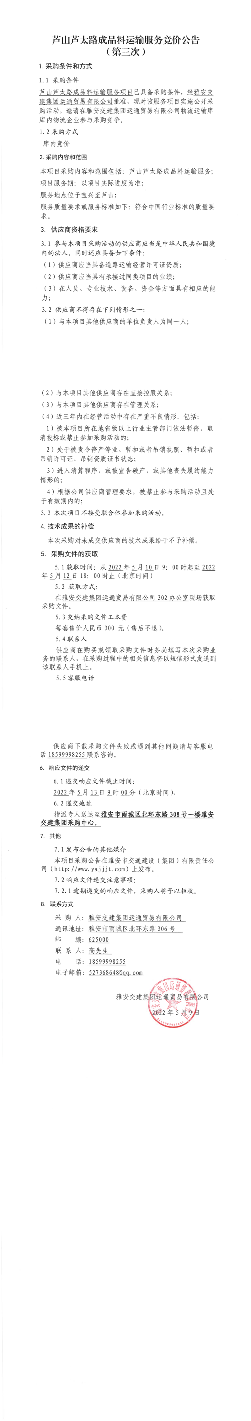 雅安交建集團運通貿易有限公司蘆山蘆太路成品料運輸服務競價公告(第三次)