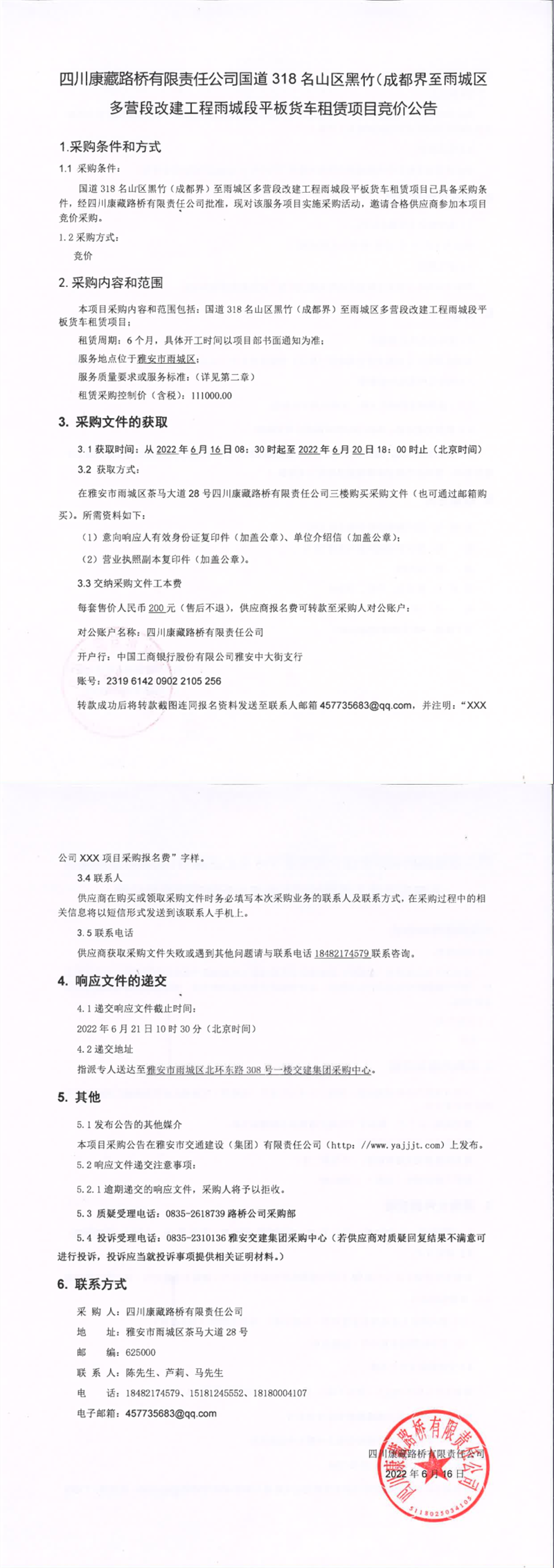 四川康藏路橋有限責(zé)任公司國(guó)道318名山區(qū)黑竹(成都界)至雨城區(qū)多營(yíng)段改建工程雨城段平板貨車(chē)租賃項(xiàng)目競(jìng)價(jià)公告