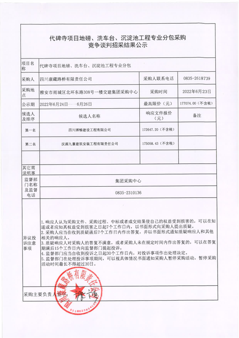 四川康藏路橋有限責(zé)任公司代碑寺項(xiàng)目地磅、洗車臺(tái)、沉淀池工程專業(yè)分包采購競爭談判招采結(jié)果公示