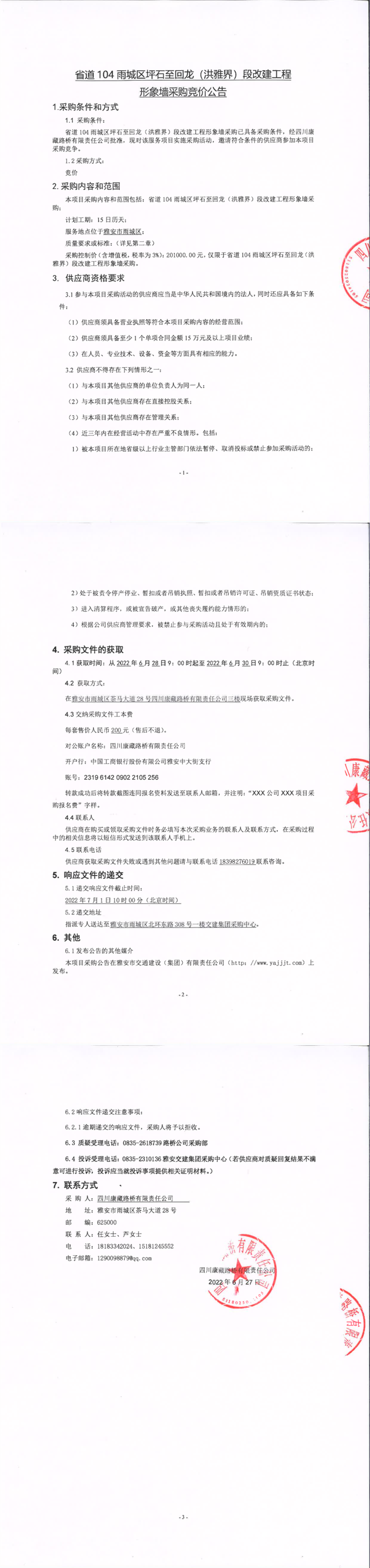 四川康藏路橋有限責(zé)任公司省道104雨城區(qū)坪石至回龍(洪雅界)段改建工程形象墻采購(gòu)競(jìng)價(jià)公告