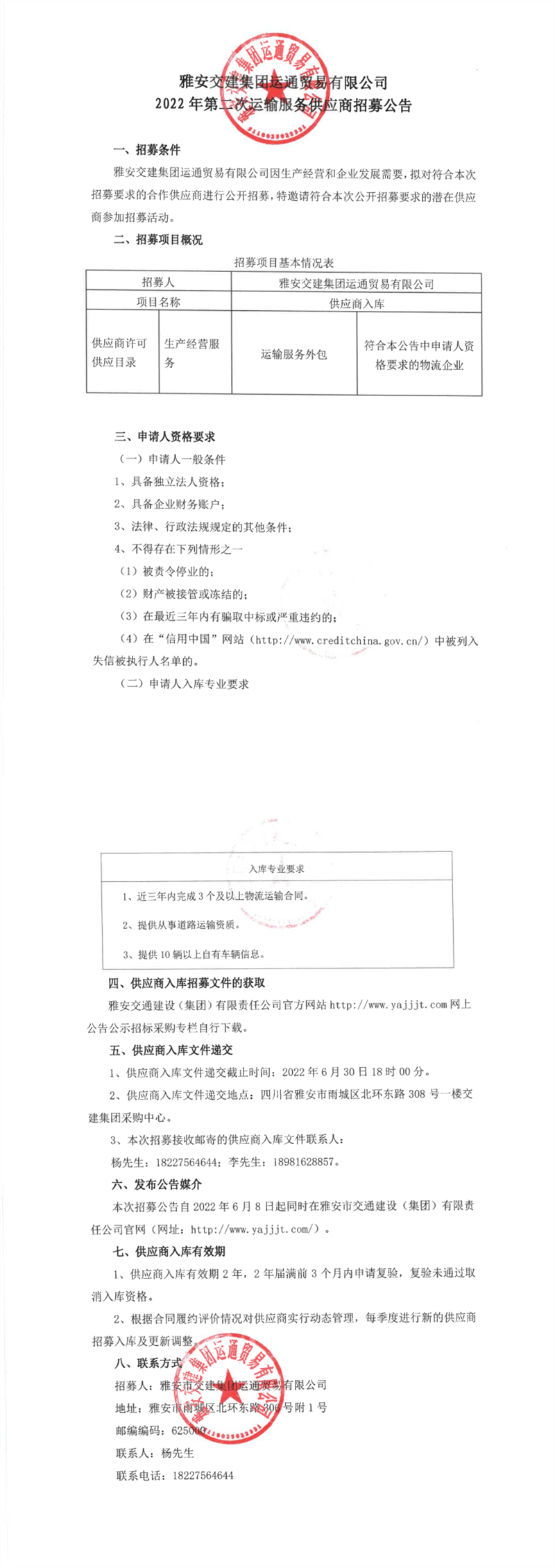 雅安交建集團(tuán)運(yùn)通貿(mào)易有限公司2022年第二次運(yùn)輸服務(wù)供應(yīng)商招募公告