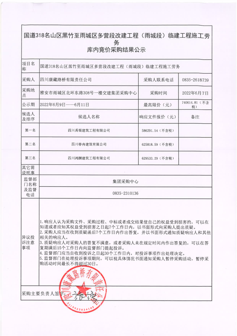 四川康藏路橋有限責任公司國道318名山區(qū)黑竹至雨城區(qū)多營段改建工程(雨城段)臨建工程施工勞務庫內競價采購結果公示
