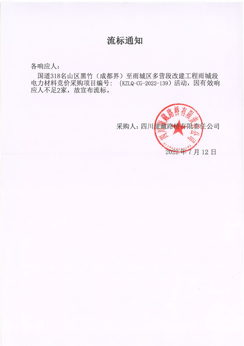 四川康藏路橋有限責(zé)任公司國(guó)道318名山區(qū)黑竹(成都界)至雨城區(qū)多營(yíng)段改建工程雨城段電力材料競(jìng)價(jià)采購(gòu)項(xiàng)目流標(biāo)通知