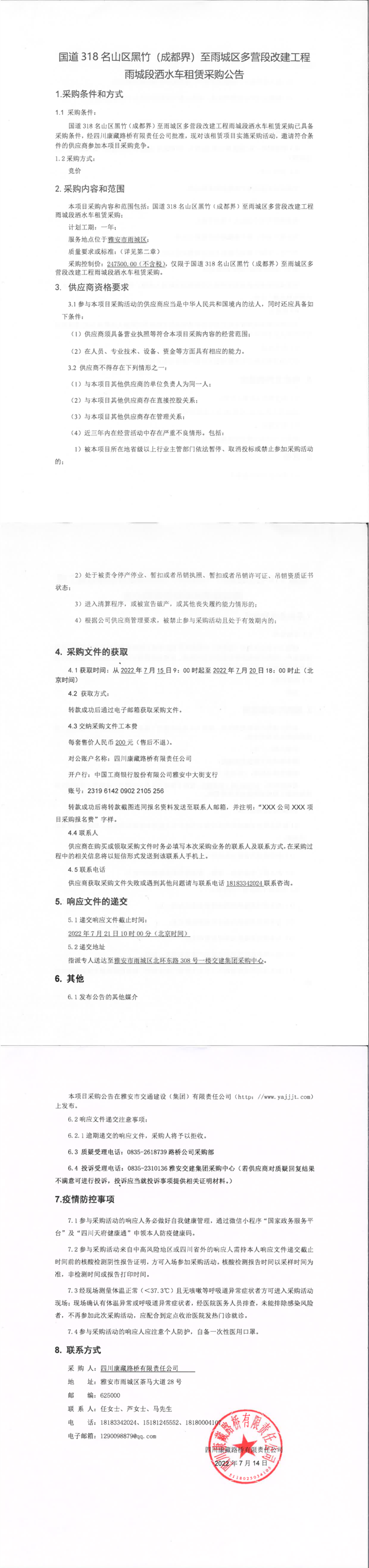 四川康藏路橋有限責(zé)任公司國(guó)道318名山區(qū)黑竹(成都界)至雨城區(qū)多營(yíng)段改建工程雨城段灑水車租賃采購(gòu)公告