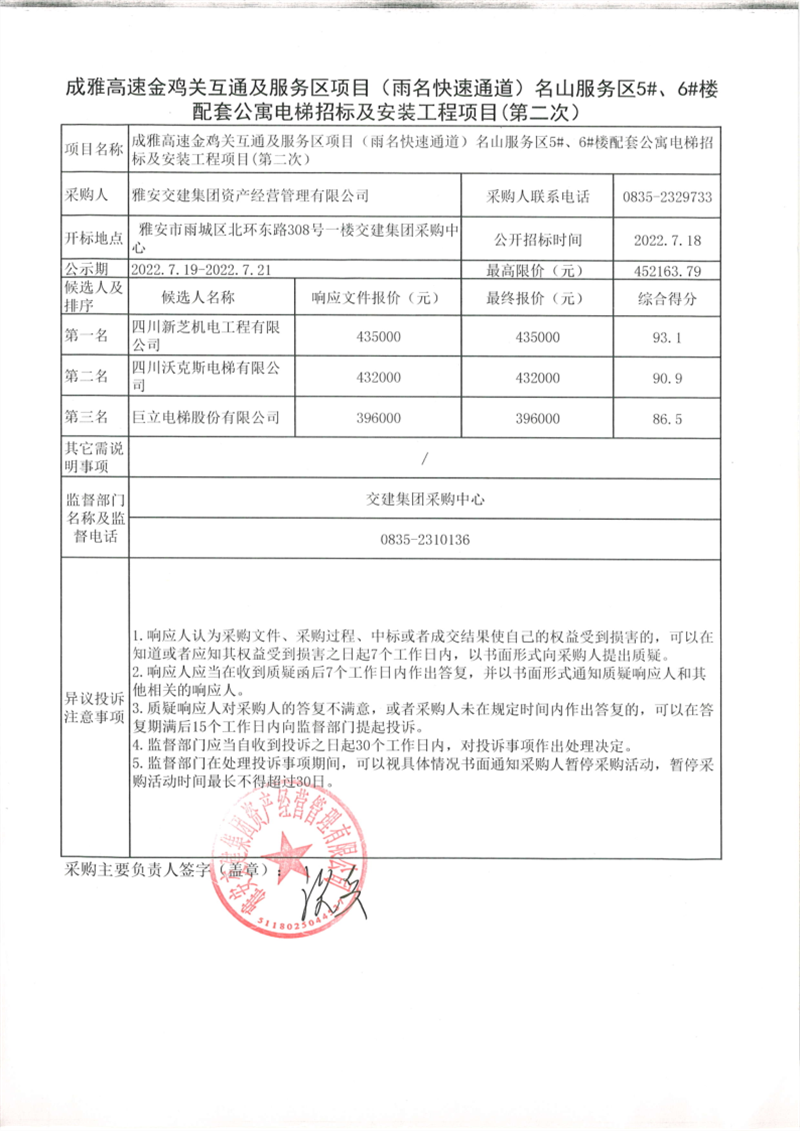 雅安交建集團(tuán)資產(chǎn)經(jīng)營(yíng)管理有限公司成雅高速金雞關(guān)互通及服務(wù)區(qū)項(xiàng)目(雨名快速通道)名山服務(wù)區(qū)5#、6#樓配套公寓電梯招標(biāo)及安裝工程項(xiàng)目招標(biāo)公告(第二次)結(jié)果公示