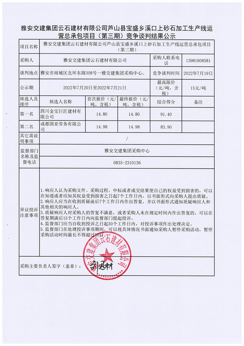 雅安交建集團(tuán)云石建材有限公司蘆山縣寶盛鄉(xiāng)溪口上砂石加工生產(chǎn)線運(yùn)營(yíng)總承包項(xiàng)目(第三期)競(jìng)爭(zhēng)談判結(jié)果公示
