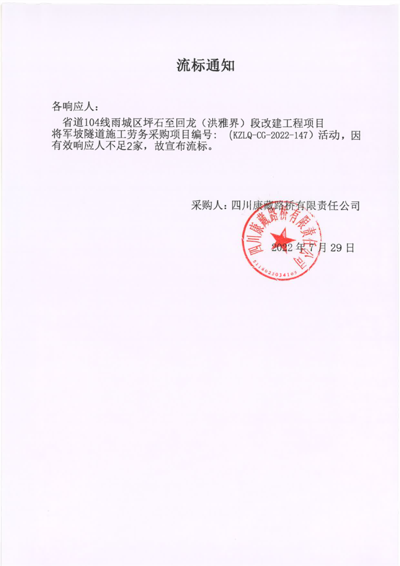四川康藏路橋有限責(zé)任公司省道104線雨城區(qū)坪石至回龍(洪雅界)段改建工程項目將軍坡隧道施工勞采購流標(biāo)通知