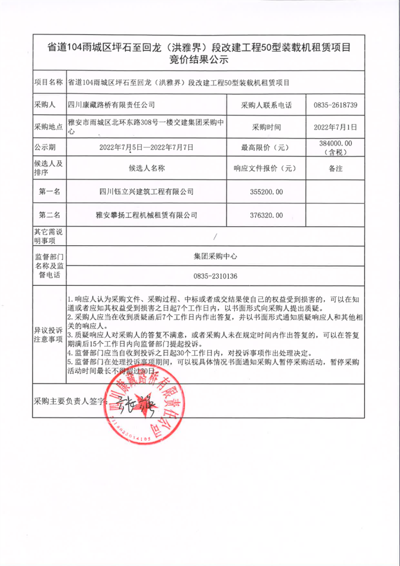 四川康藏路橋有限責(zé)任公司省道104雨城區(qū)坪石至回龍(洪雅界)段改建工程50型裝載機(jī)租賃項(xiàng)目競價(jià)結(jié)果公示