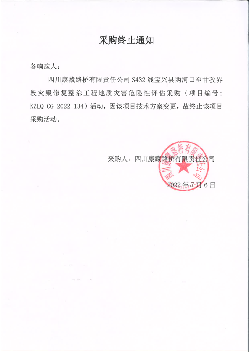 四川康藏路橋有限責(zé)任公司S432線寶興縣兩河口至甘孜界段災(zāi)毀修復(fù)整治工程地質(zhì)災(zāi)害危險(xiǎn)性評(píng)估采購(gòu)終止通知