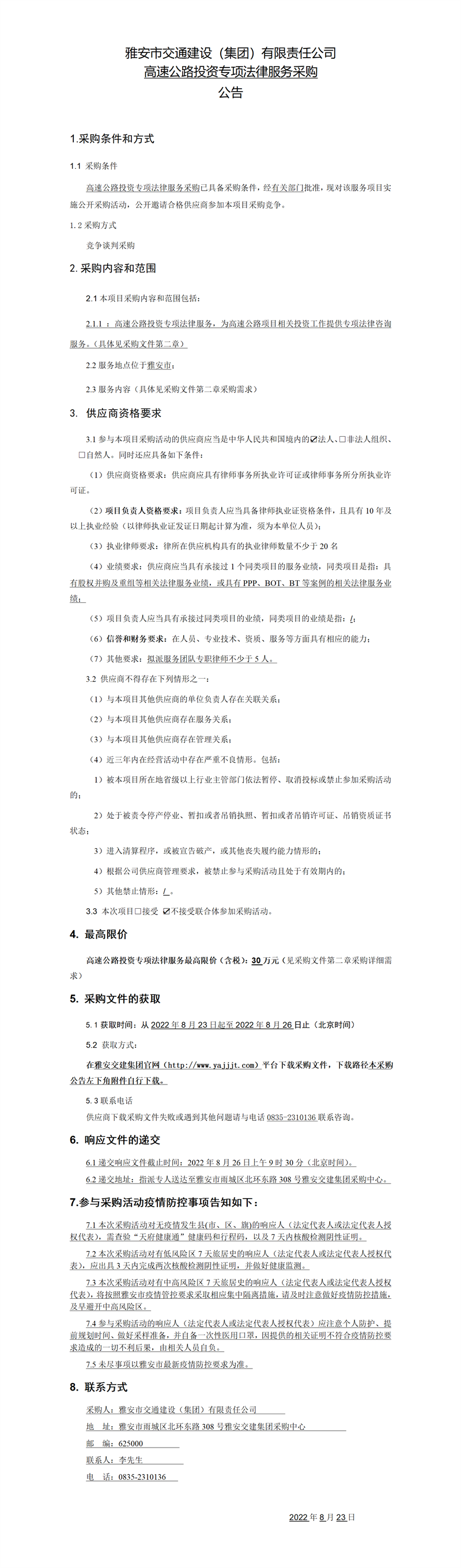 雅安市交通建設(集團)有限責任公司高速公路投資專項法律服務采購公告