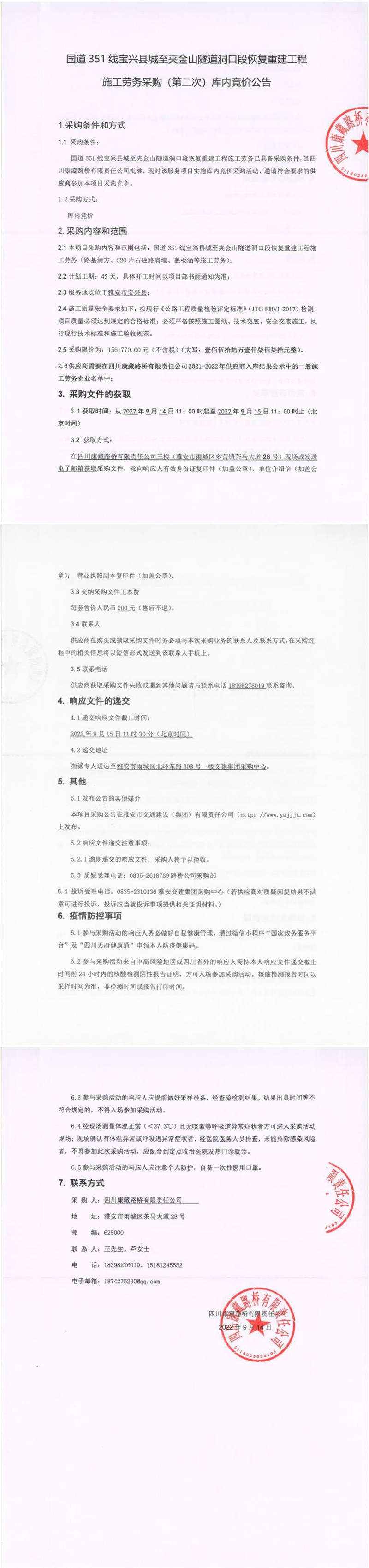 四川康藏路橋有限責(zé)任公司國道351線寶興縣城至夾金山隧道洞口段恢復(fù)重建工程施工勞務(wù)采購(第二次)庫內(nèi)競價(jià)公告