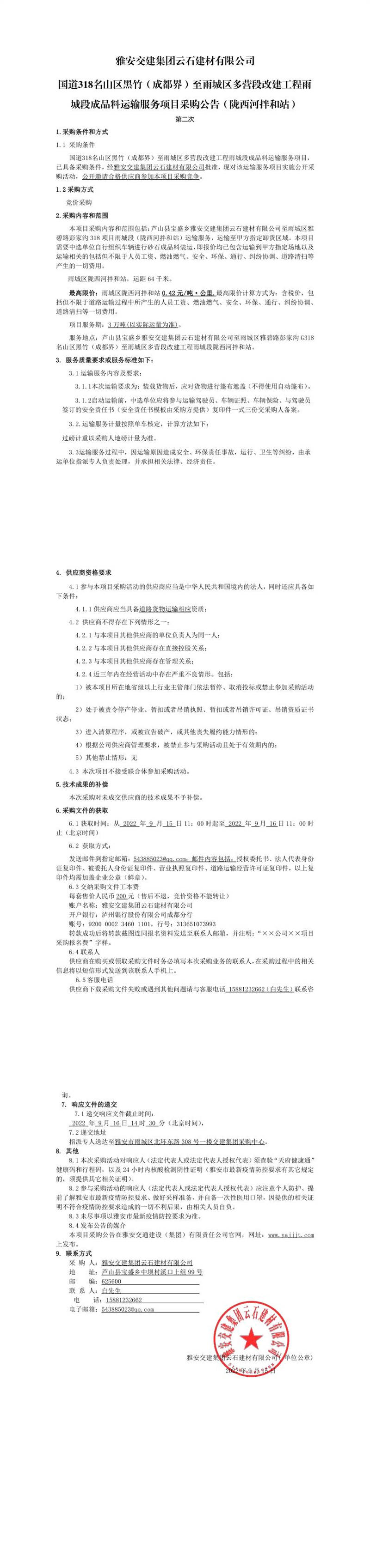 雅安交建集團(tuán)云石建材有限公司國(guó)道318名山區(qū)黑竹(成都界)至雨城區(qū)多營(yíng)段改建工程雨城段成品料運(yùn)輸服務(wù)項(xiàng)目采購(gòu)公告(隴西河拌和站)
