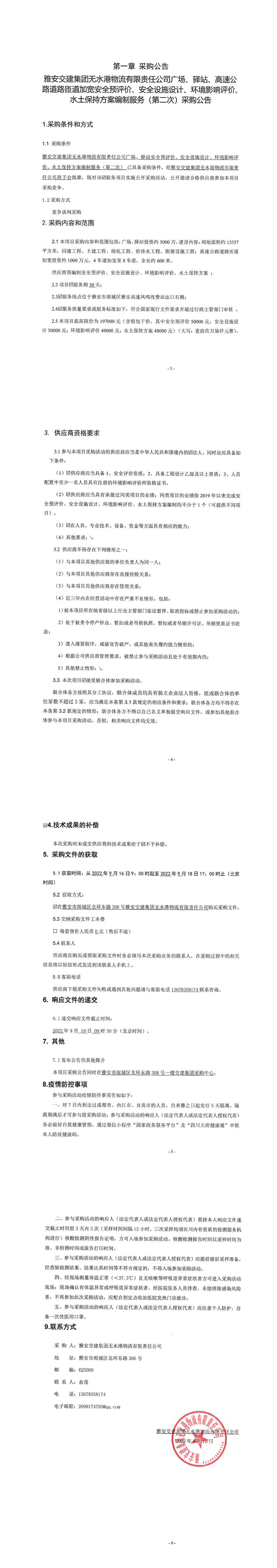 雅安交建集團無水港物流有限責(zé)任公司廣場、驛站、高速公路道路匝道加寬安全預(yù)評價、安全設(shè)施設(shè)計、環(huán)境影響評價、水土保持方案編制服務(wù)(第二次)采購公告