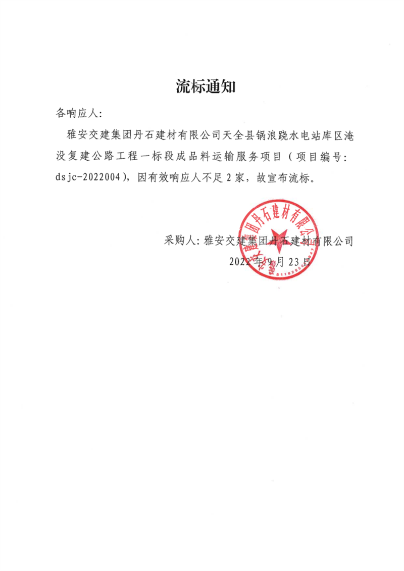 雅安交建集團(tuán)丹石建材有限公司天全縣鍋浪蹺水電站庫區(qū)淹沒復(fù)建公路工程一標(biāo)段成品料運(yùn)輸服務(wù)項(xiàng)目流標(biāo)通知