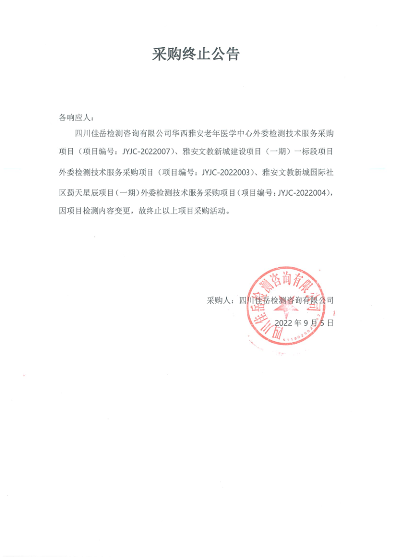 四川佳岳檢測咨詢有限公司采購項(xiàng)目(項(xiàng)目編號:JYJC-2022007、JYJC-2022003、JYJC-2022004)采購中止公告
