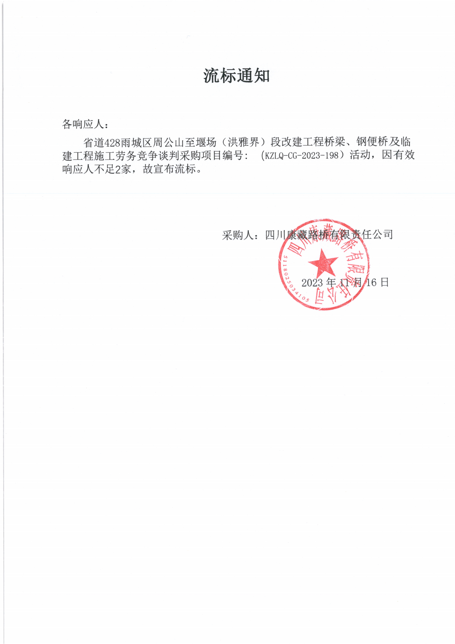 四川康藏路橋有限責(zé)任公司省道428雨城區(qū)周公山至堰場(chǎng)(洪雅界)段改建工程橋梁、鋼便橋及臨建工程施工勞務(wù)采購(gòu)流標(biāo)通知