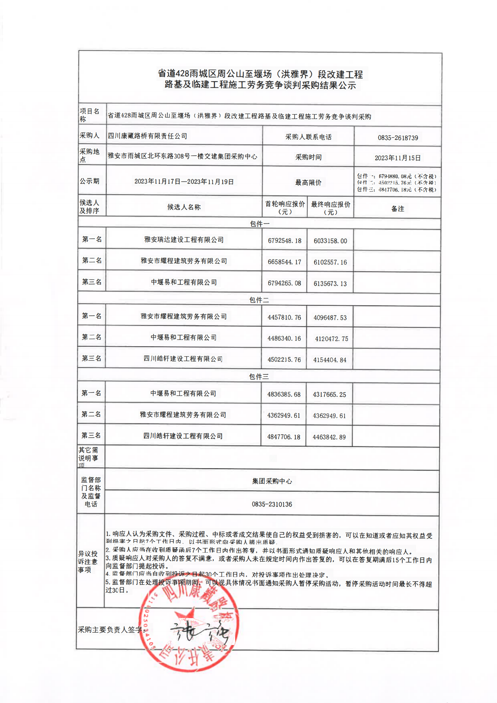 四川康藏路橋有限責(zé)任公司省道428雨城區(qū)周公山至堰場(洪雅界)段改建工程路基及臨建工程施工勞務(wù)競爭談判采購結(jié)果公示