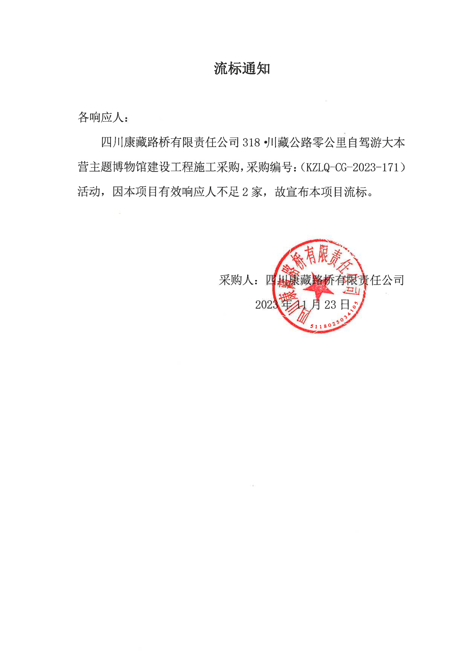 四川康藏路橋有限責任公司318·川藏公路零公里自駕游大本營主題博物館建設(shè)工程施工采購流標通知