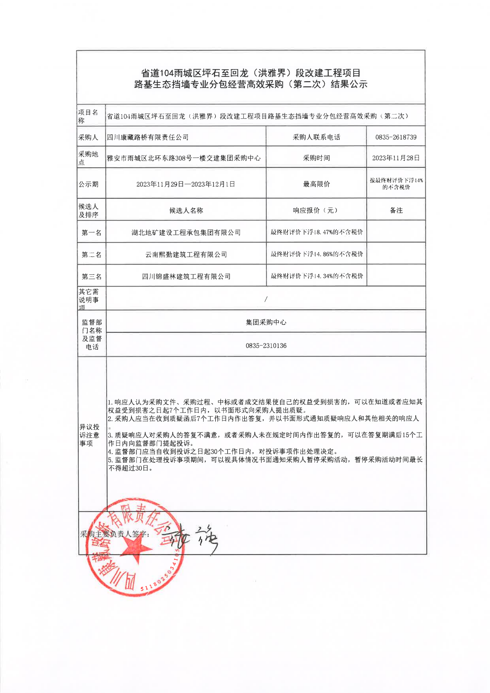 四川康藏路橋有限責任公司省道104雨城區(qū)坪石至回龍(洪雅界)段改建工程項目路基生態(tài)擋墻專業(yè)分包經營高效采購(第二次)結果公示
