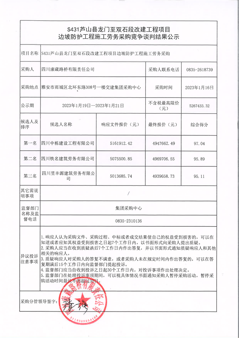 四川康藏路橋有限責(zé)任公司S431蘆山縣龍門至雙石段改建工程項目邊坡防護工程施工勞務(wù)采購競爭談判結(jié)果公示