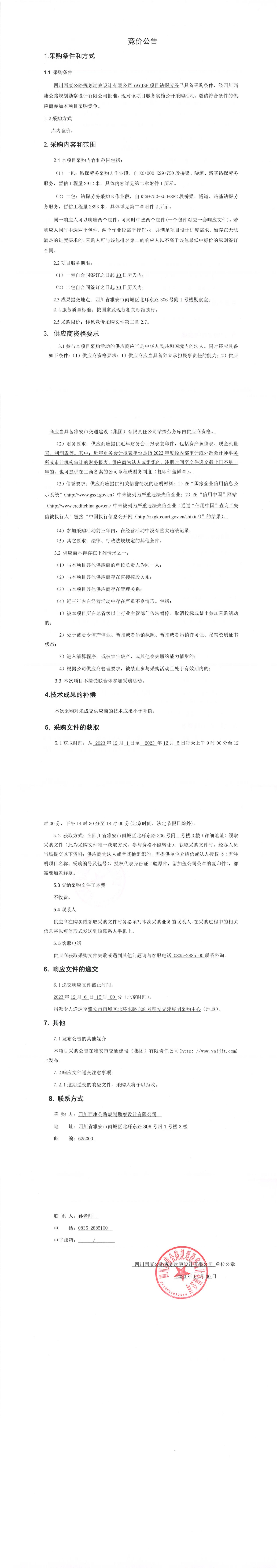 四川西康公路規(guī)劃勘察設(shè)計有限公司YAYJSP目鉆探勞務(wù)競價公告