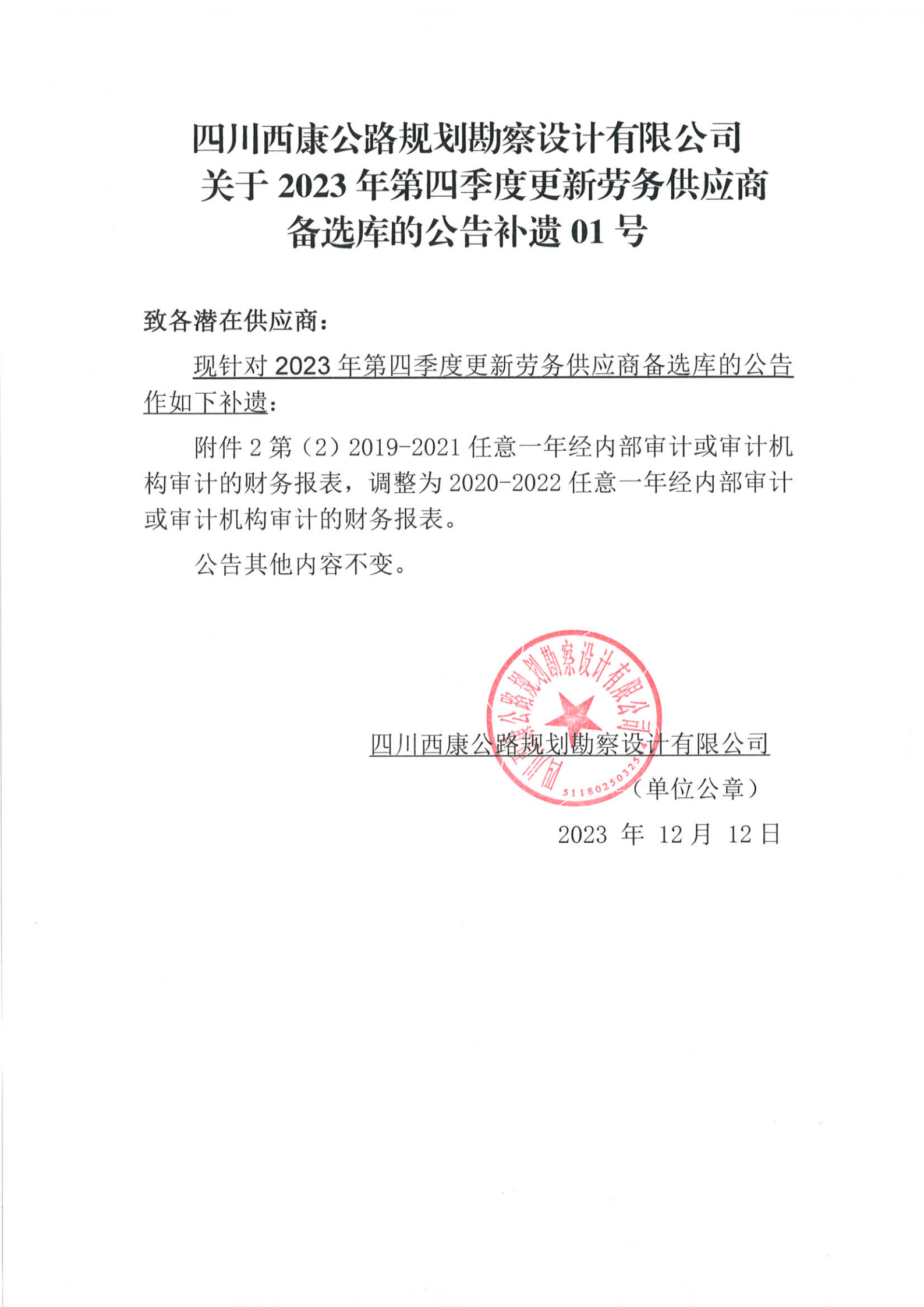 四川西康公路規(guī)劃勘察設計有限公司關于2023年第四季度更新勞務供應商備選庫的公告補遺01號