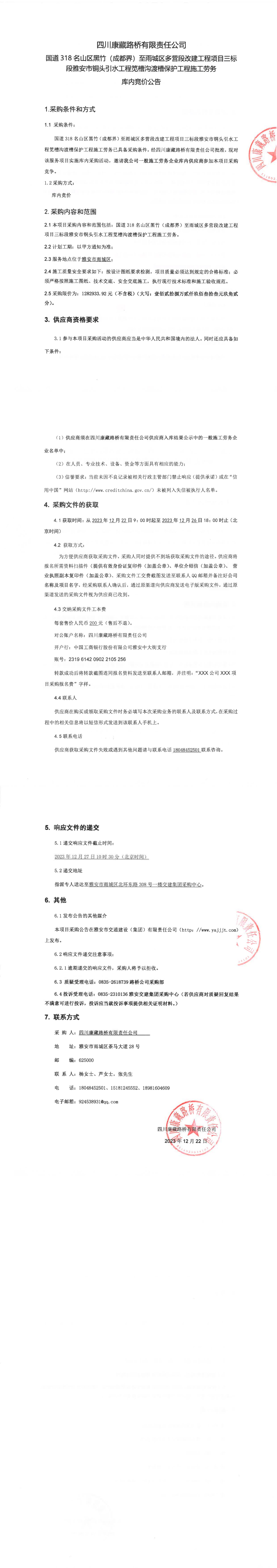 四川康藏路橋有限責(zé)任公司國道318名山區(qū)黑竹(成都界)至雨城區(qū)多營段改建工程項目三標(biāo)段雅安市銅頭引水工程筧槽溝渡槽保護工程施工勞務(wù)庫內(nèi)競價公告