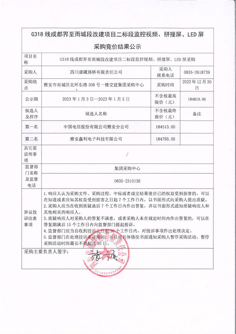 四川康藏路橋有限責(zé)任公司G318線成都界至雨城段改建項(xiàng)目二標(biāo)段監(jiān)控視頻、拼接屏、LED屏采購競價(jià)結(jié)果公示