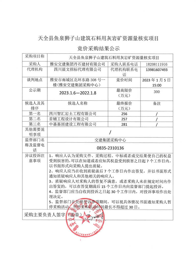 雅安交建集團(tuán)丹石建材有限公司天全縣魚泉獅子山建筑石料用灰?guī)r礦資源量核實項目競價采購結(jié)果公示