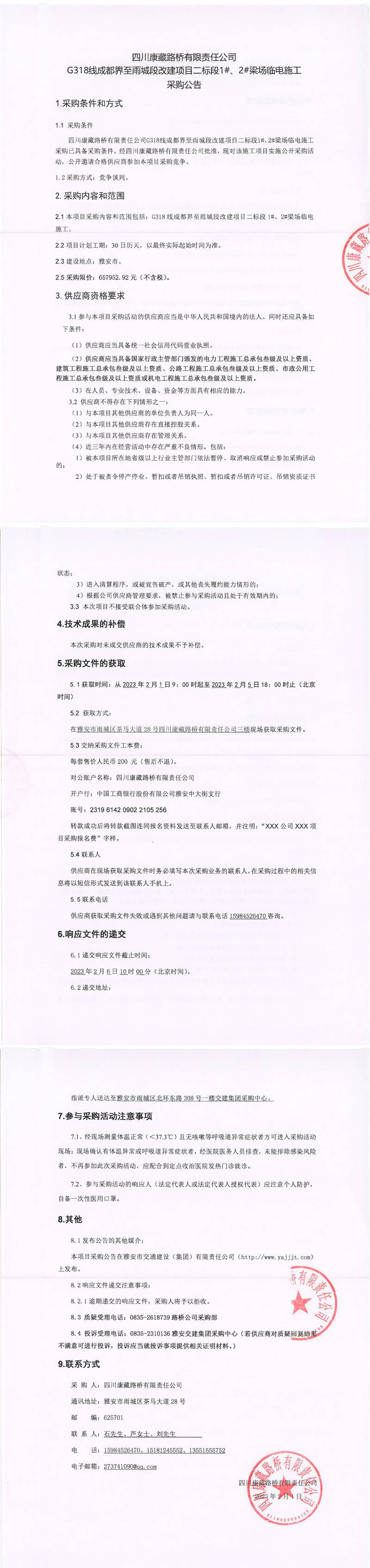 四川康藏路橋有限責(zé)任公司G318線成都界至雨城段改建項目二標段1#、2#梁場臨電施工采購公告