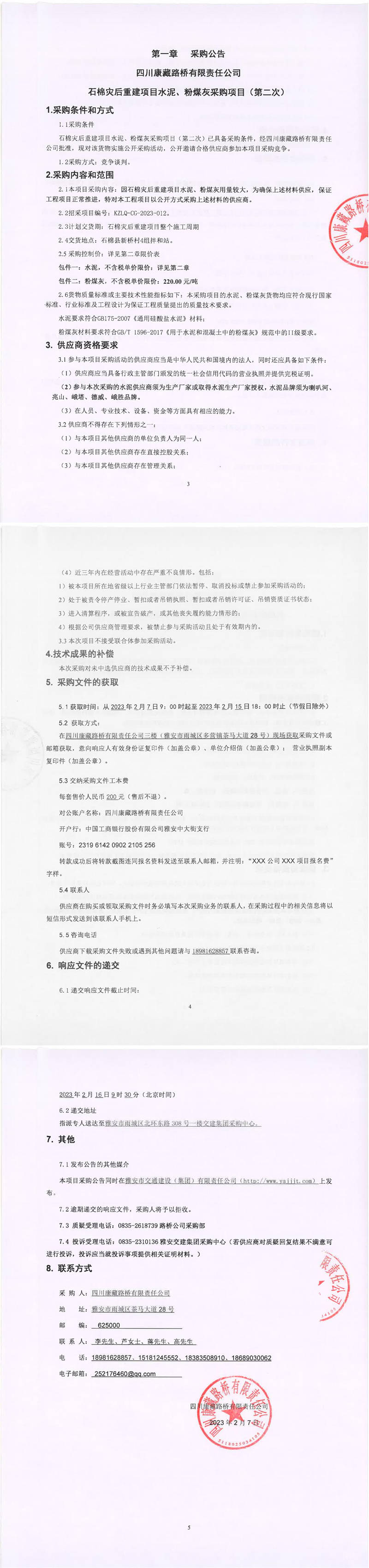 四川康藏路橋有限責任公司石棉災重建項目水泥、粉煤灰采購項目(第二次)采購公告