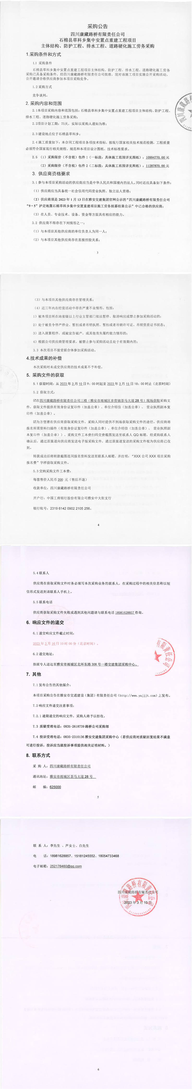 四川康藏路橋有限責任公司石棉縣草科鄉(xiāng)集中安置點重建工程項目主體結構、防護工程、排水工程、道路硬化施工采購公告
