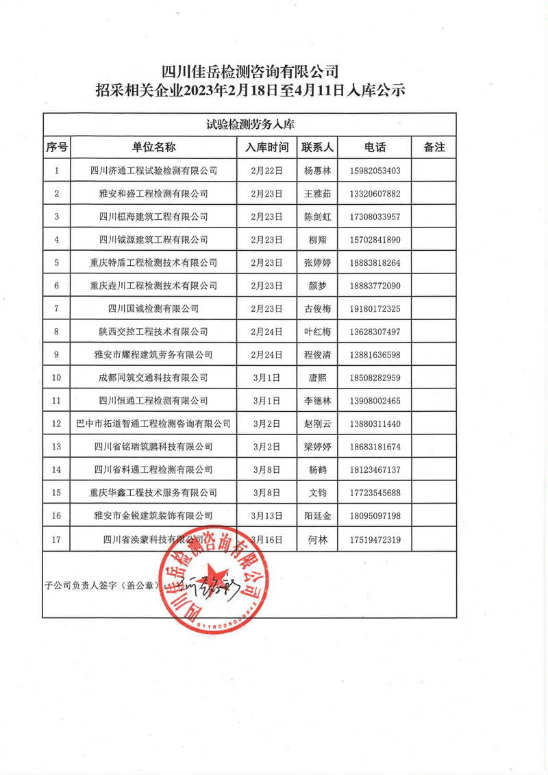 四川佳岳檢測咨詢有限公司(試驗檢測勞務供應商庫)2023年2月18日至4月11日入庫結果公示