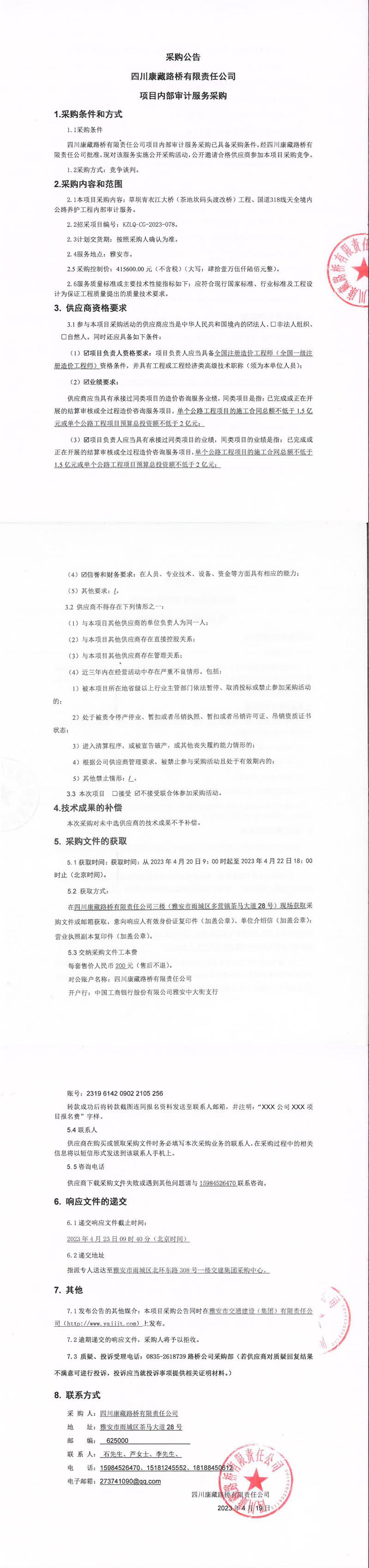 四川康藏路橋有限責(zé)任公司項目內(nèi)部審計服務(wù)采購公告