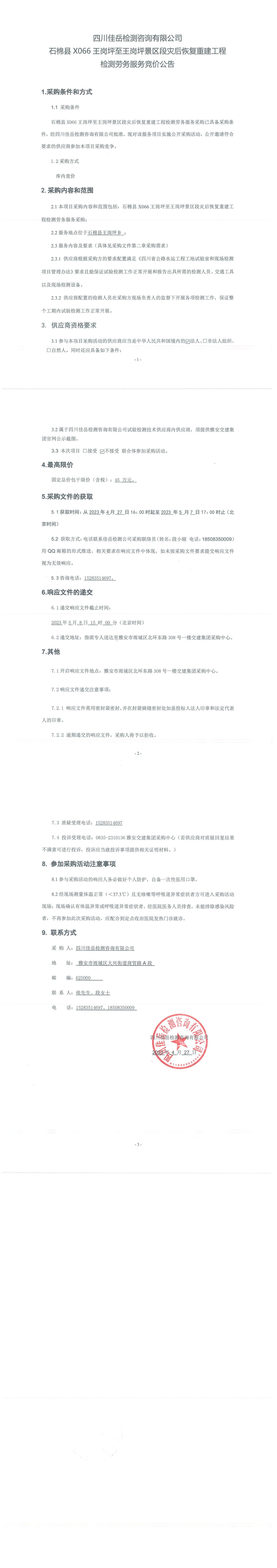 四川佳岳檢測(cè)咨詢(xún)有限公司石棉縣X066王崗坪至王崗坪景區(qū)段災(zāi)后恢復(fù)重建工程檢測(cè)勞務(wù)服務(wù)競(jìng)價(jià)公告