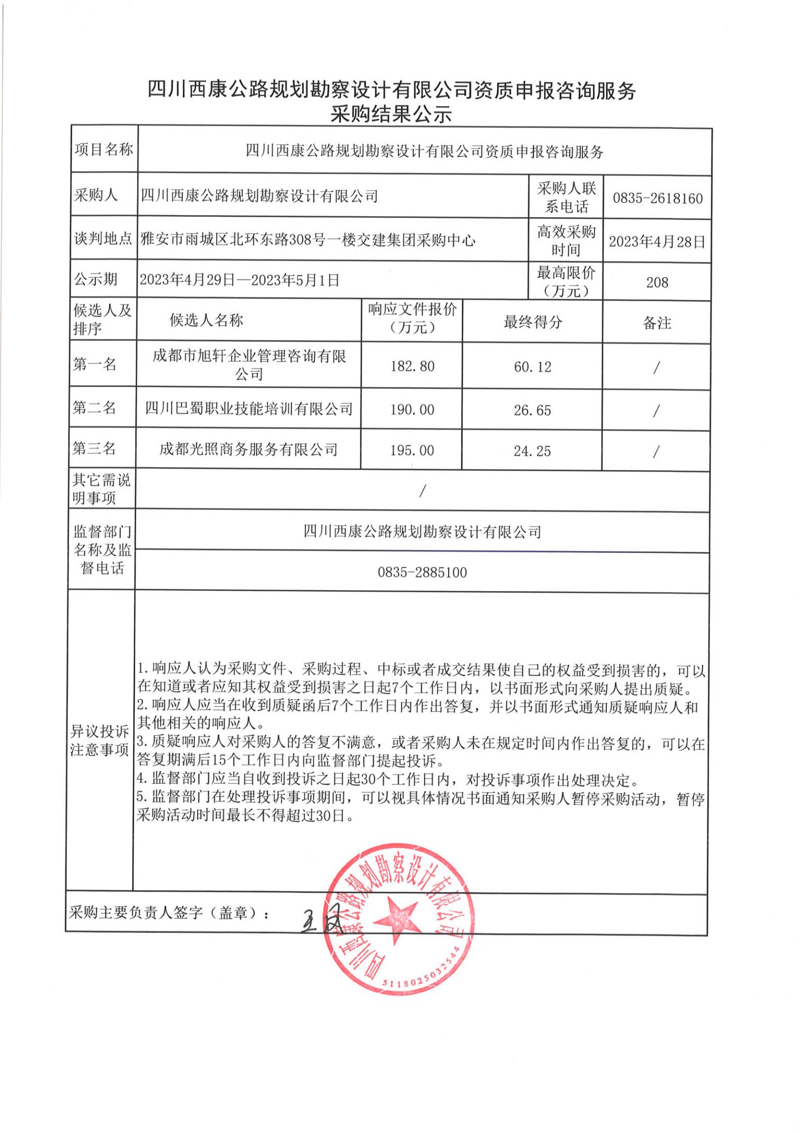 四川西康公路規(guī)劃勘察設(shè)計有限公司資質(zhì)申報咨詢服務(wù)采購結(jié)果公示