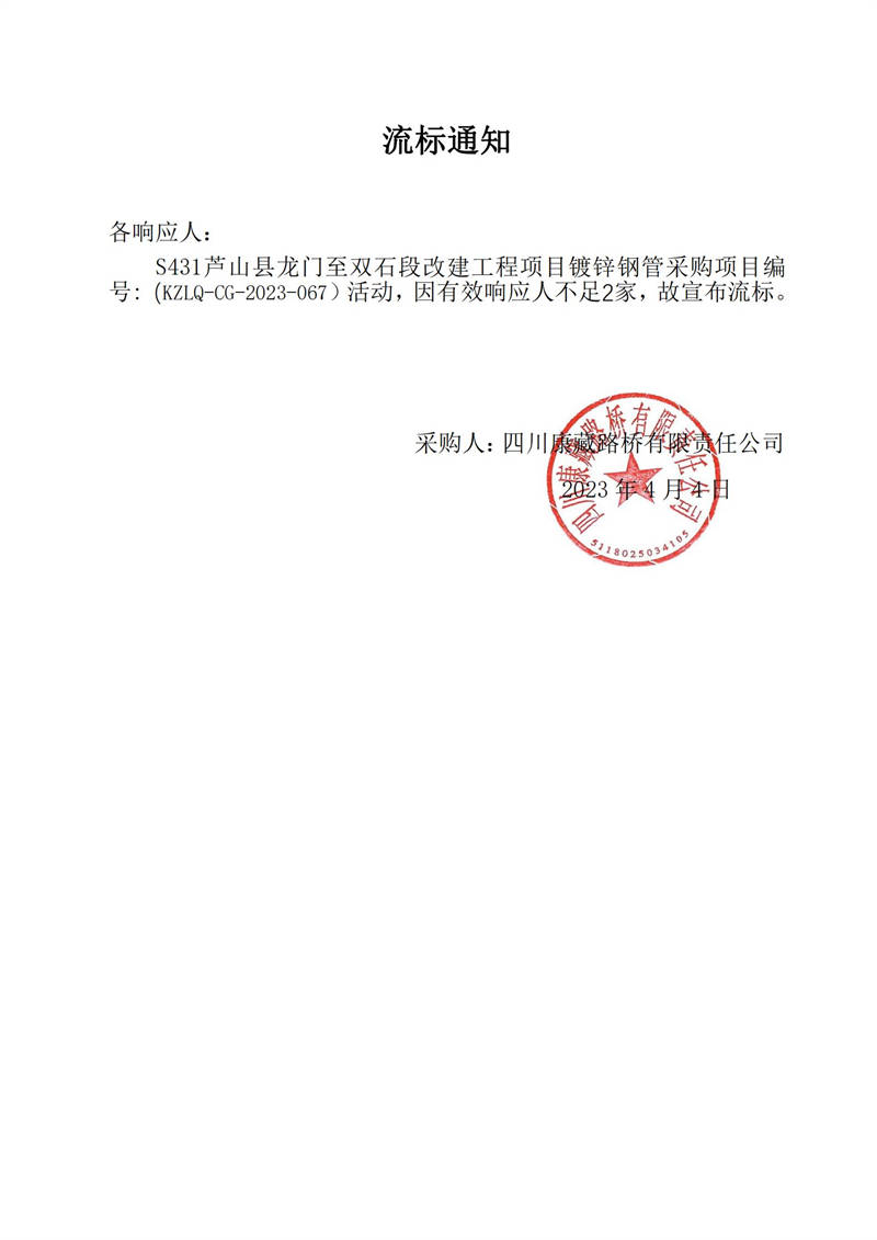 四川康藏路橋有限責(zé)任公司S431蘆山縣龍門至雙石段改建工程項目鍍鋅鋼管采購流標(biāo)通知