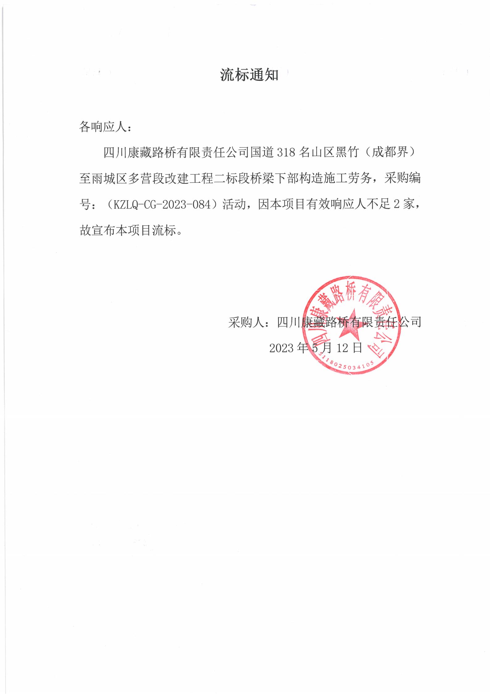 四川康藏路橋有限責任公司國道318名山區(qū)黑竹(成都界)至雨城區(qū)多營段改建工程二標段橋梁下部構造施工勞務流標通知
