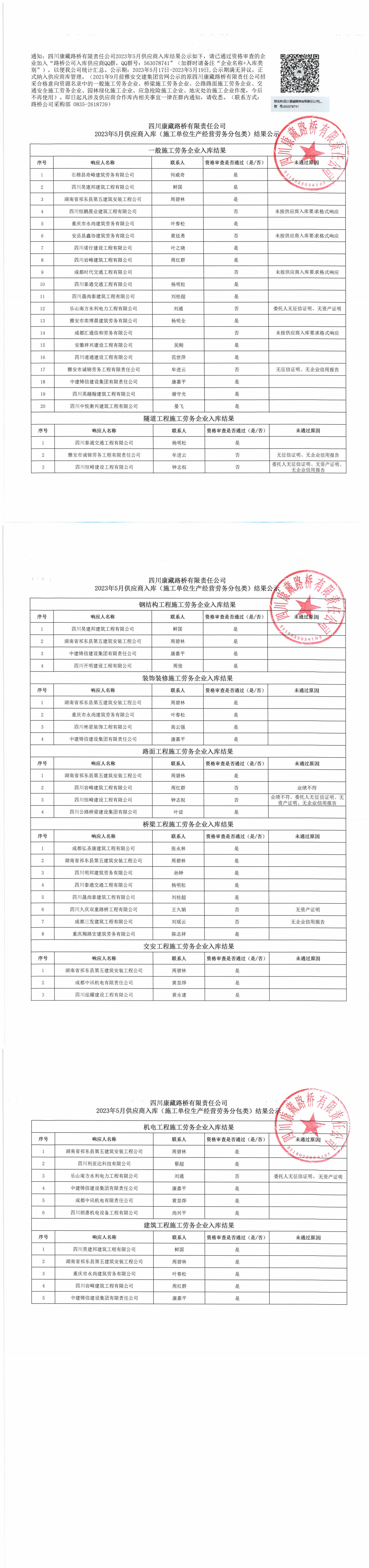 四川康藏路橋有限責(zé)任公司2023年5月供應(yīng)商入庫(施工單位生產(chǎn)經(jīng)營(yíng)勞務(wù)分包類)結(jié)果公示